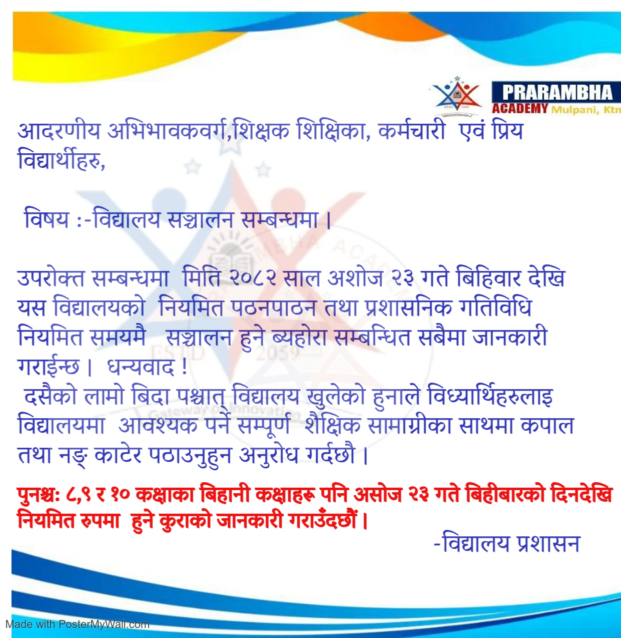 उपरोक्त सम्बन्धमा मिति २०८२ साल अशोज २३ गते बिहिवार देखि यस विद्यालयको नियमित पठनपाठन तथा प्रशासनिक गतिविधि नियमित समयमै सञ्चालन हुने ब्यहोरा सम्बन्धित सबैमा जानकारी गराईन्छ । धन्यवाद !