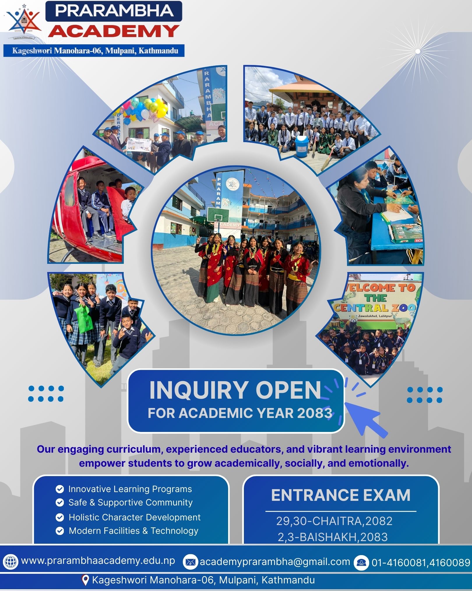 " Gateway to Innovation "Prarambha Academy one of the reputed institution of Kathmandu Valley which lies in the heart of Kageshwori Manohara-06, Kathmandu, Nepal. It was established with the aim of offering the best available schooling services to the children of this locality. The motto of the school is to enrich every pupil with exciting opportunities to learn in any type of environment through various co-curricular and extracurricular activities .We are strengthening our academic input through advanced technology ,highly experie...